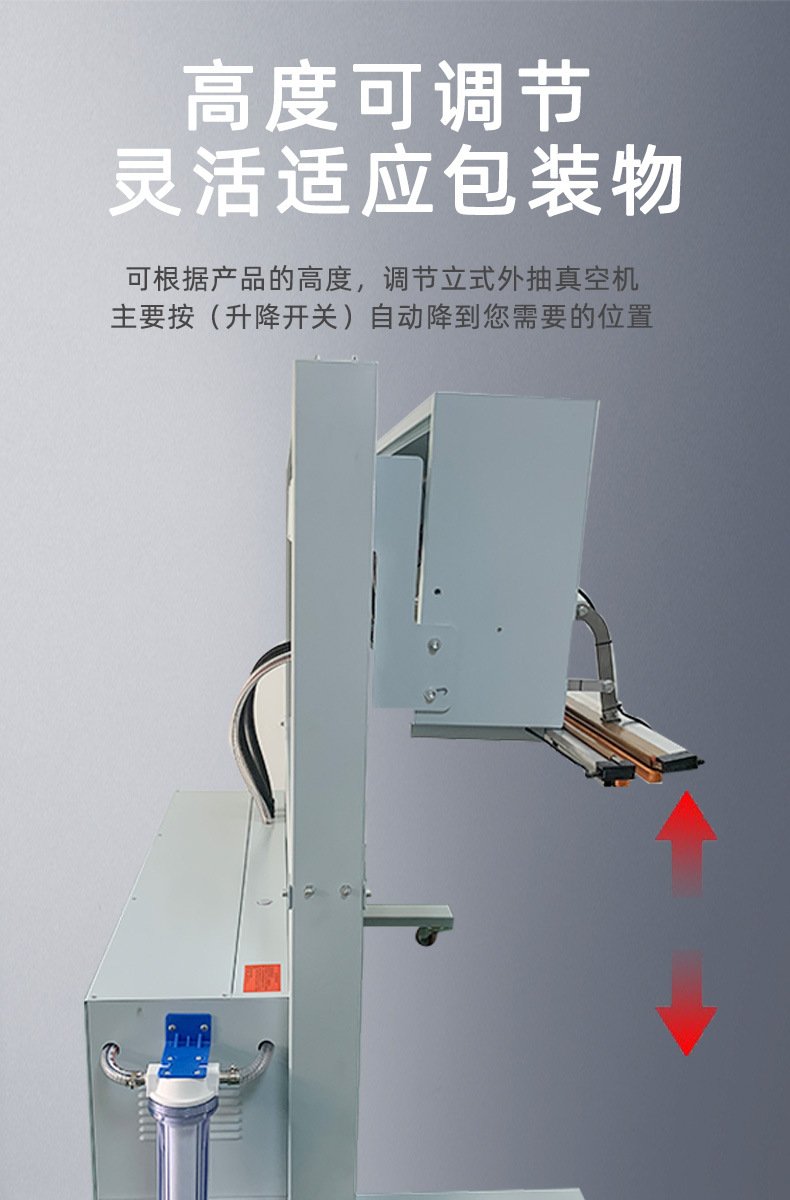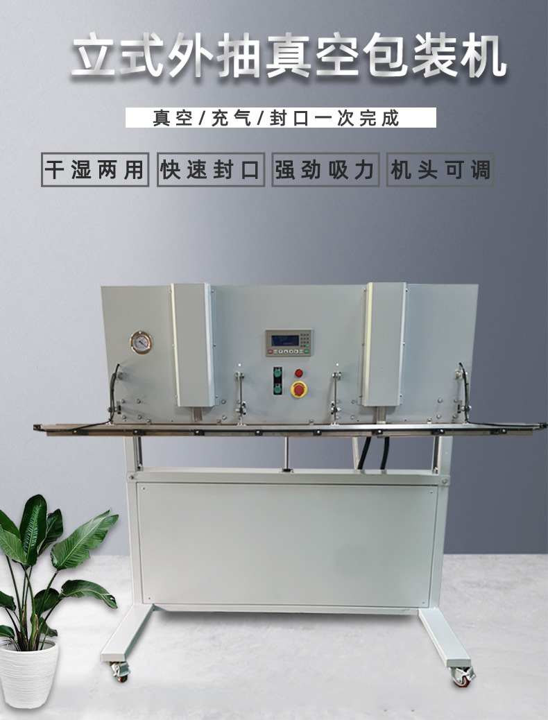 與普通立式外抽真空包裝機類似,可升降立式外抽真空包裝機也是通過抽氣嘴放入被包裝物的包裝袋內,啟動真空泵抽出空氣,達到預定真空度后退出抽氣嘴,最后利用封口裝置完成封口,實現真空包裝。在包裝過程中,可升降機構能夠根據包裝物的高度調整工作臺或輸送臺的位置,確保包裝操作的順利進行。部分機型還可在抽真空后充入氮氣等惰性氣體,以滿足不同產品的包裝需求。