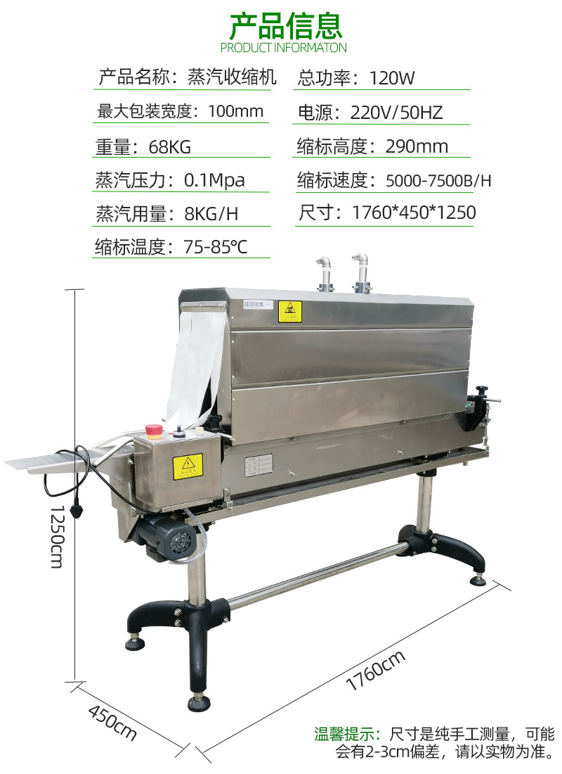 精準控溫:能夠根據(jù)不同的包裝材料和產(chǎn)品需求,精確調(diào)節(jié)蒸汽溫度,確保收縮效果的一致性和穩(wěn)定性。比如在食品包裝中,對于不同材質(zhì)的保鮮膜,都能實現(xiàn)恰到好處的收縮,既保護了食品,又提升了外觀。