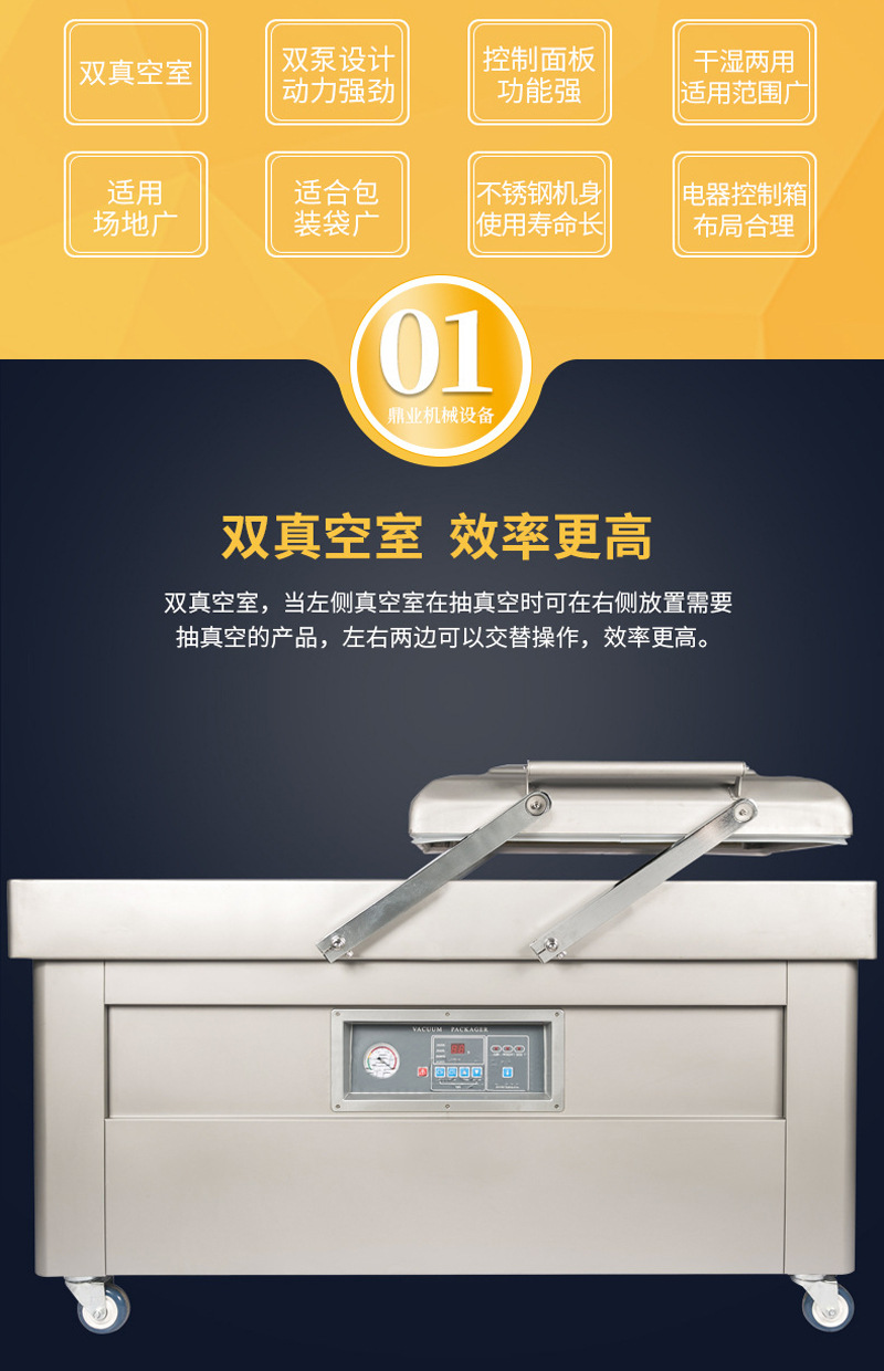 它的顯著特征是擁有兩個(gè)獨(dú)立的真空室,這兩個(gè)真空室可以交替工作,從而大大提高了包裝的效率。