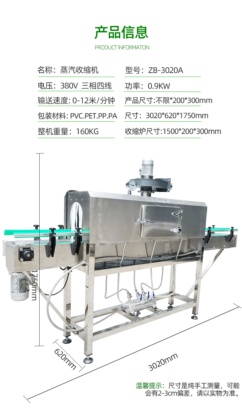 - 純蒸汽加熱型:這種蒸汽收縮機僅依靠蒸汽的熱量來實現包裝膜的收縮。它的優(yōu)點是熱傳遞均勻,能夠使包裝膜緊密且平整地貼合在產品表面。例如,在包裝一些高檔化妝品禮盒時,純蒸汽加熱可以確保包裝膜不會出現褶皺,保持禮盒的精美外觀。
