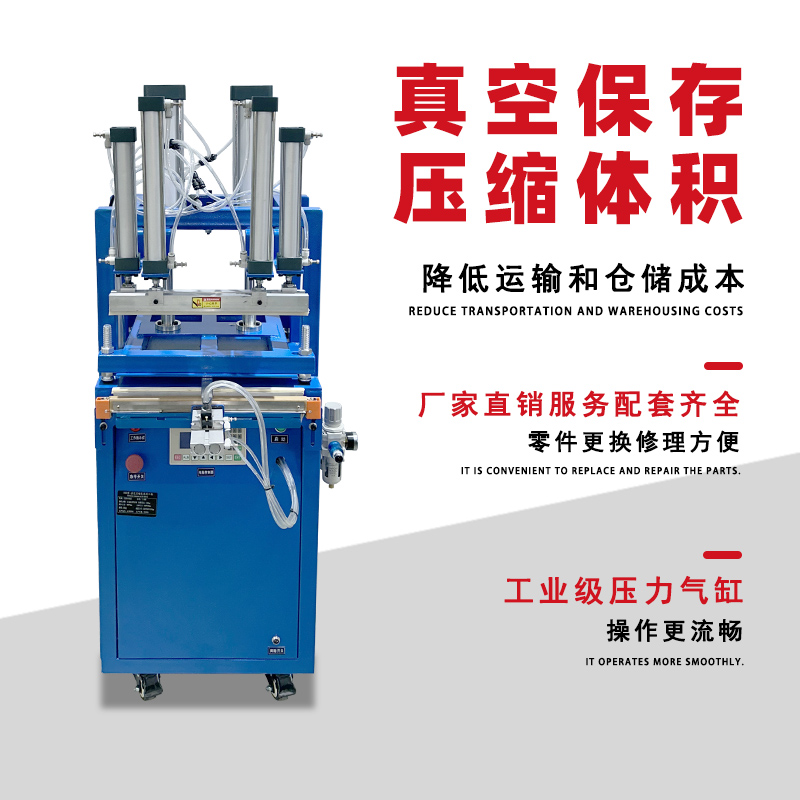 工作原理 抽氣:通過氣嘴或類似裝置,利用真空泵對包裝袋內的空氣進行抽真空作業,隨著包裝內及被包裝物中的空氣被抽出,包裝袋體積減小,從而達到壓縮包裝物體積的目的。 封口:在抽氣完成后,通過封口作業將包裝袋口封牢,防止空氣回流,出現漲袋的問題。 壓縮:部分機型還會采用氣缸壓縮產品的方式,將包裝袋內的空氣進一步排出去,使得包裝袋內部形成 “偽真空狀態”,從而裹緊產品或包裝件。 性能特點 縮小包裝空間:能極大地縮小蓬松物品的包裝體積,降低儲藏運輸成本。 延長產品保質期:包裝后的物品能達到密封、防潮、防污染等功能,