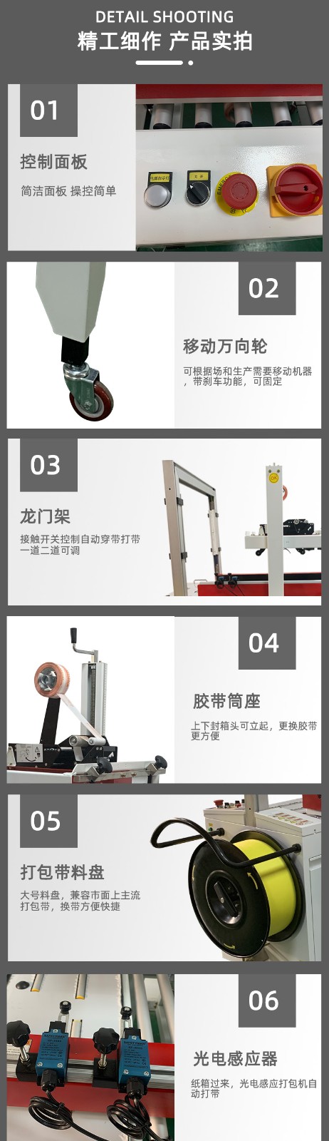 封箱打包一體機是一種機電一體化的自動裝箱設備,?它結合了自動折蓋封箱機和全自動捆包機,?形成了一個完整的包裝流水線系統。?這種機器特別適用于食品、?醫藥、?日化等行業,?能夠處理各種大小貨物的打包捆扎,?包括紙箱打包、?紙張打包、?藥箱打包等。?它的設計特點是臺面滾筒無動力,?針對顧客封箱及捆包雙機一體設計,?使得封箱、?捆包作業一體化,?提高了工作效率,?降低了人力成本。?